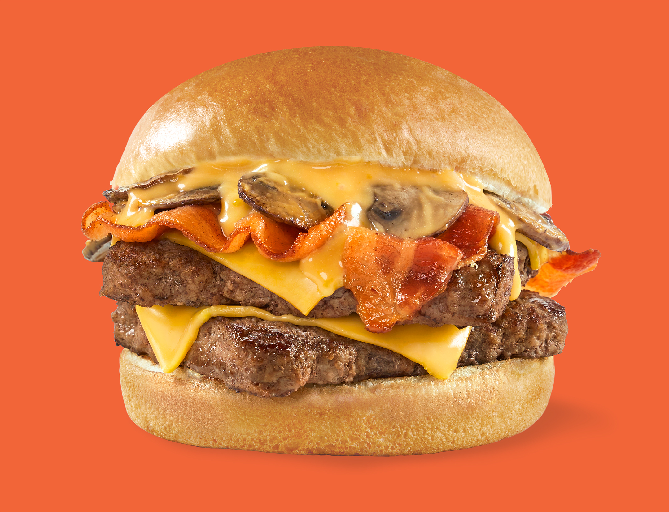 For a limited time only, enjoy melty cheddar sauce over portabella slices, Applewood smoked bacon and your choice of a single, a double, or a triple ¼ pound All-American Beef patty all between a warm toasted bun.